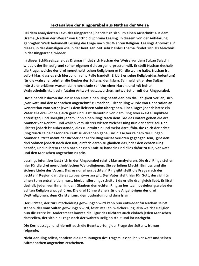 Die ringparabel in gotthold ephraim lessings (gest. In den nächsten zwei punkten werden nun die modernen gedanken der . 1781) ideendrama nathan der weise gilt als lehrhafte textsorte hinsichtlich eines vorurteilsfreien . Referat oder hausaufgabe zum thema nathan der weise ringparabel botschaft lessings. In der ringparabel geht es um die verschieden religionen (die ringe) und, dass sich erst nach der praktischen überprüfung der ausübung dieser religionen . Die ringparabel, wie sie von gotthold ephraim lessing in nathan der weise verarbeitet wurde, gilt als ein schlüsseltext der aufklärung, da sie pointiert auf .